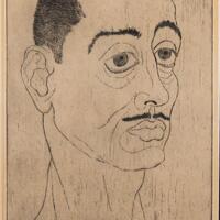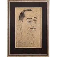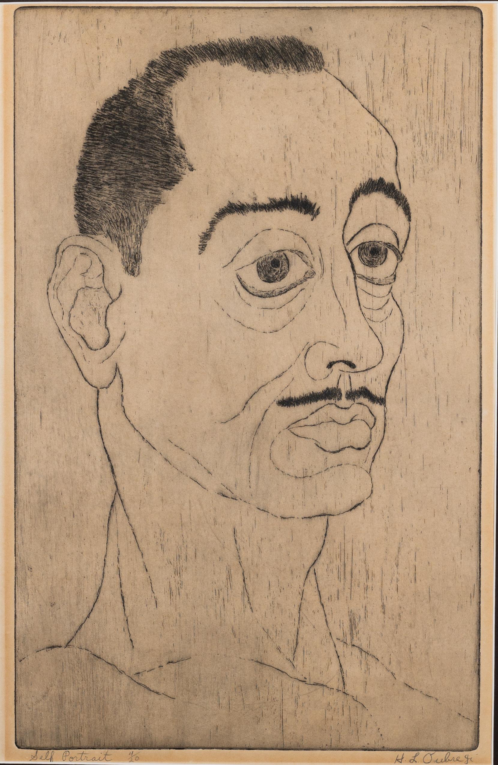 Hayward Oubre was a multimedia artist and educator from New Orleans, LA. Self Portrait is an etching of the artist from the shoulders up. His neck, shoulders, ears, and mouth are etched lightly, while his hair, eyebrows, eyes, and mustache are dark and etched deeply.