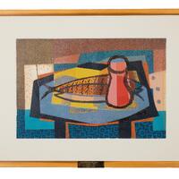 Howard E. Lewis was an Art professor and Korean War veteran from Columbus, OH. Still Life with Fish is a watercolor depiction of two fish and a vase on a table. Lewis uses stark shapes, colors, and patterns to create the fish, vase, table, and background.