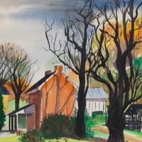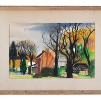 Gladys Williams Renwick was a painter from St.Louis, MO. Kirks Mill is a watercolor painting of a rural neighborhood in Autumn. The painting features four homes of various sizes and colors. There are various trees in the background: some barren and others with orange and green leaves.