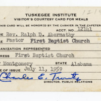 A visitor pass issued to civil rights activist Rev. Ralph Abernathy to eat lunch after delivering his Sunday sermon to the community.
