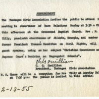 An announcment made by Dr Charles G. Gomillion inviting the public to attend a meeting over race relation with Mrs. Dorothy Tilly being a guest speaker.