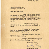 A letter from Mrs. Dorothy Tilly to Charles G. Gomillion in which she states that she will speak at 3:30 p.m. She also asks if she can rest in the morning due to the hectic nature of the past few days of travel.