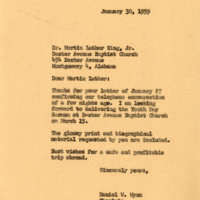 A letter from Chaplain Wynn to Dr. Martin Luther King Jr. expressing excitement for the upcoming Youth Day Sermon at Dexter Avenue Baptist Church. In addition, Chaplain Wynn provided a glossy photo of himself and a biographical sketch that the Dexter Avenue Baptist Church needs for flyers.