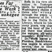 Newspaper article about Monroe N. Work's funeral service at Tuskegee. Article states that the office in Hollis Burke Frissell Library was closed in memory of Mr. Work and that Mrs. Florence Work was unable to attend the service due to illness.