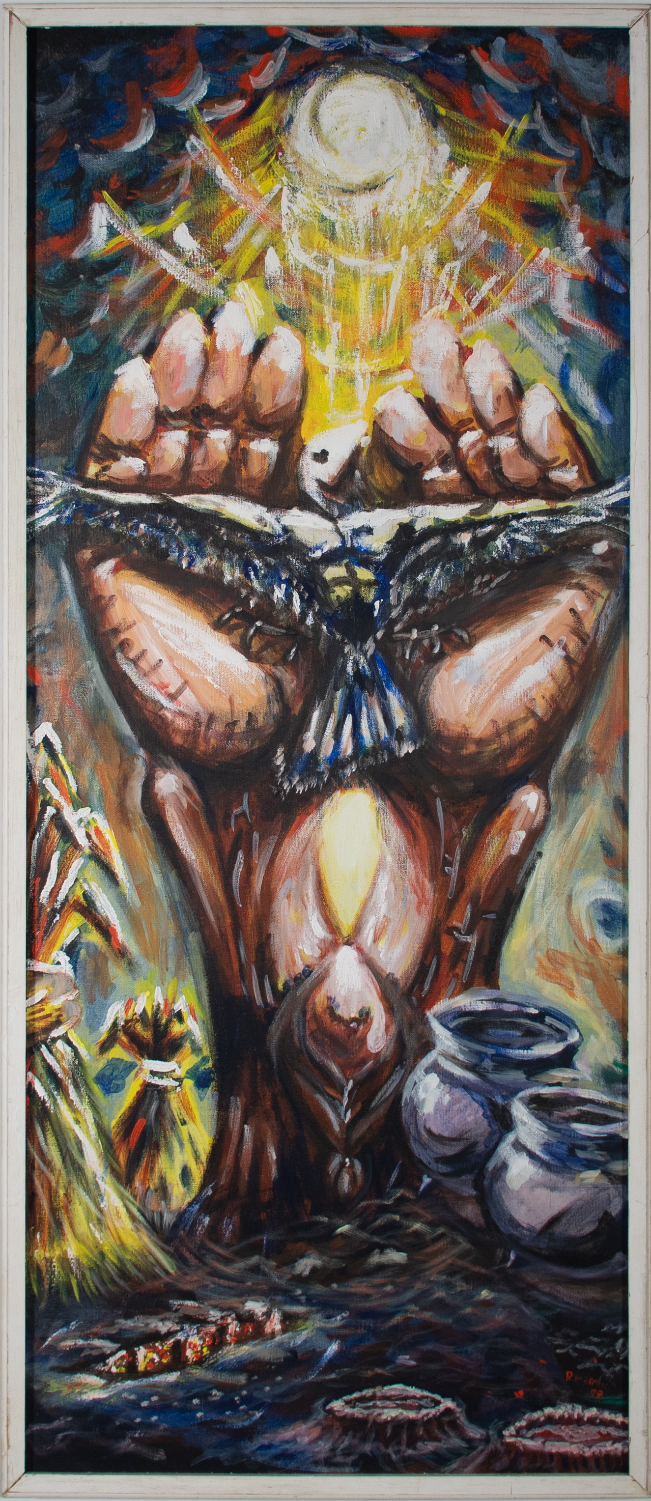This detailed painting by Barry Morris includes a pair of hands rising up and clasping a bird. There are also bundles of wheat and a set of vessels. This work is very similar to the leftmost section of Morris's Hannah Hall mural and may have served as a partial study for the mural. Oversized, detailed hands and birds are frequent motifs in the artist's work.