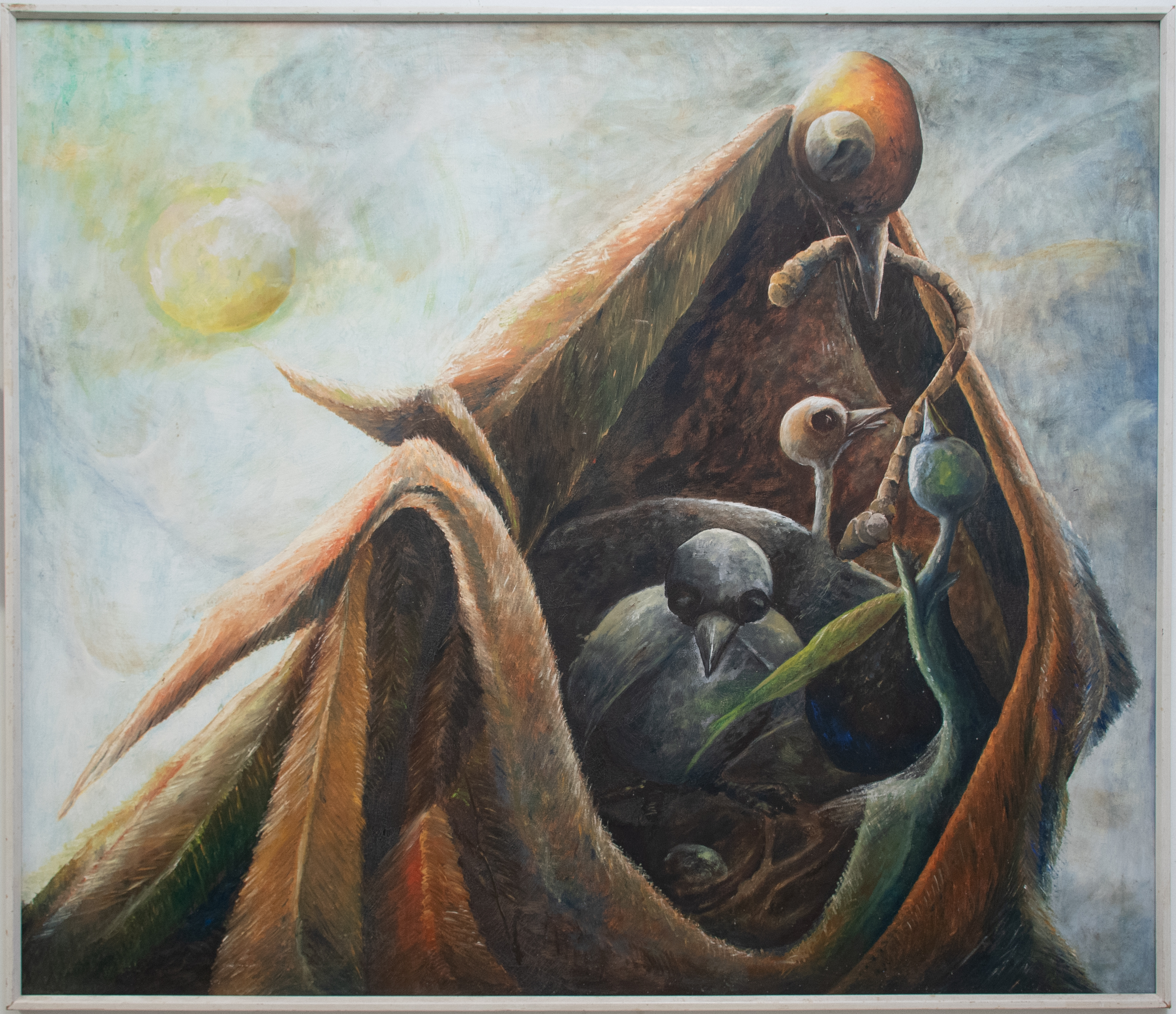 Vital's painting depicts a bird feeding a worm to its three offspring, reflecting the theme of the mother & child(ren) relationship that often appears in TSU student work. The artist often featured animals and nature in his work. After his graduation, Vital taught art for many years at Texas Southern.