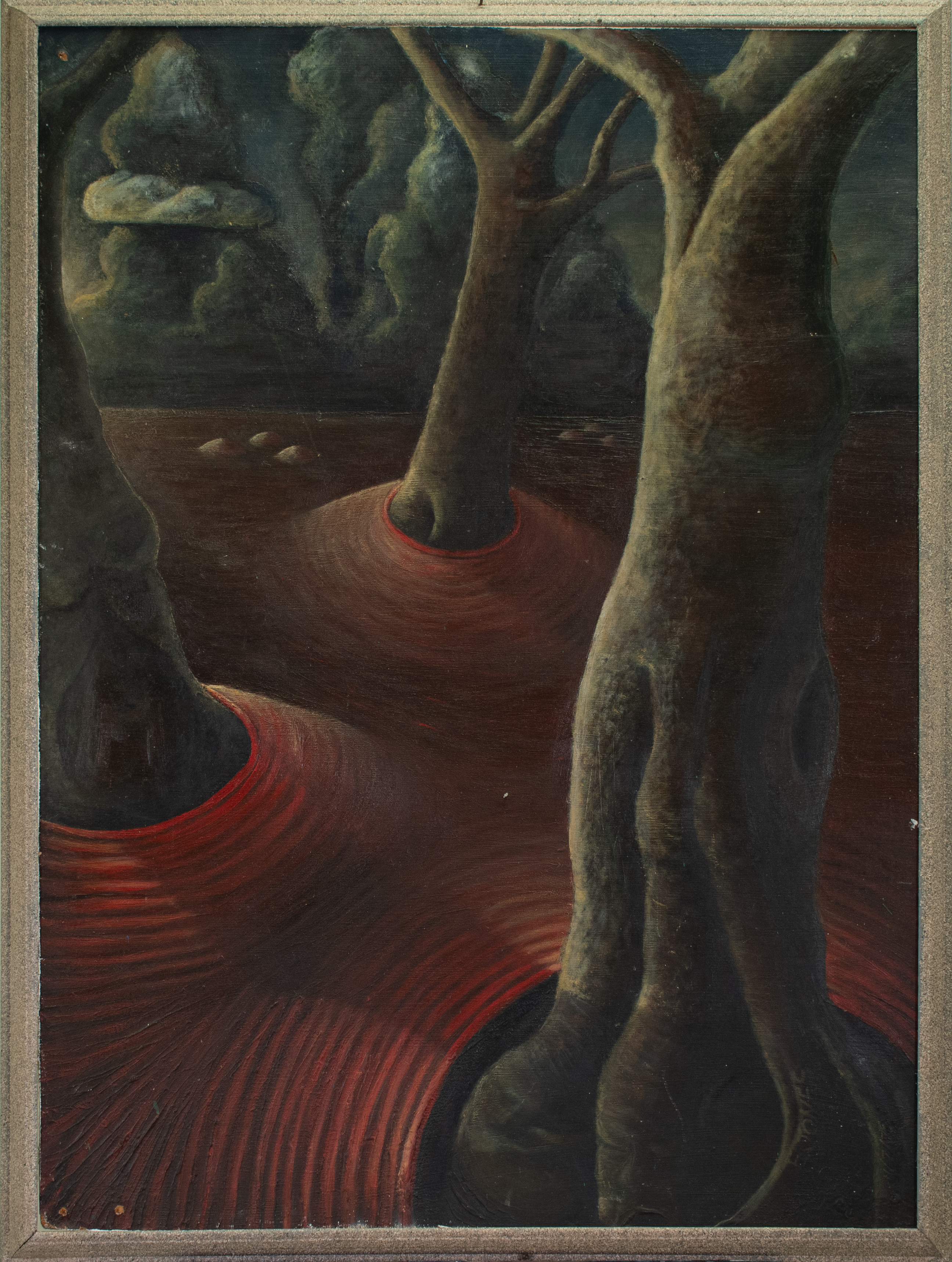 This work by Earl Jones is an abstract, desert landscape of barren trees, emerging from red and orange rings in the ground. Jones was a student at Texas Southern in the mid-1970s and was taught by artists and instructors like Dr. John T. Biggers and Professor Carroll Harris Simms. Biggers frequently urged his students to draw inspiration from nature and their immediate surroundings.