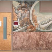 Gordon’s mural examines her own life and personal development. A wispy fabric running through the mural serves as a metaphor for her emerging self-awareness; this motif is found in some of her other works. Gordon’s mural showcases herself working on several art projects from her undergraduate period.