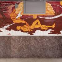The red and orange-hued apocalyptic scene shows the moments after an explosion. In the middle, a dying woman’s soul leaves her body. The mural appears to have been left unfinished, as the baby, one hand, and parts of the foreground and background are not painted in.