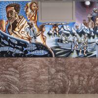 The mural shows fishing life along the water. In the middle and on the right, a man is doubled over from his burden, while a group of fishermen brings their catch to shore. On the left, an elderly man and other figures suggest the trials and challenges of the ancestors.