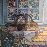 Samples’ mural unfolds like a dream, with each panel above the sleeping artist revealing a constellation of scenes from the artist’s youth. Lower window panels evoke a harmonious existence with nature and animals, while upper panels reveal struggles with racism in the South and his mother’s death.