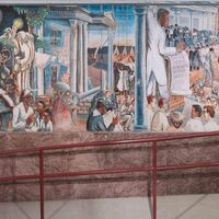 Washington’s mural is a timeline of Black education. On the left, he depicts slavery and lynching above enslaved people secretly reading. In the center, students write “Emancipation Proclamation” and Booker T. Washington delivers his "Atlanta Compromise" speech. The right depicts emerging Black professionals.