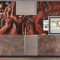 Oliver's mural reflects his classical painting style in a composition that shows Black men struggling to lift up an imposing weight above them, represented by the closed window on the wall. The mural appears to have been painted over an older design, as can be seen in the lower right section.