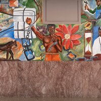 This mural reflects themes of emancipation and progress. The figure of a Black man raises his fist, while broken chains dangle from his waist. The bales of cotton and chains allude to slavery. Black men in various professions represent changes brought by emancipation.