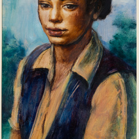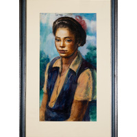 John Woodrow Wilson, a sculptor, painter, and printmaker from Roxbury, MA, was known for his creative portraits. Portrait of Claire is a portrait of a young Black woman. Her black hair is styled upwards, and a pink ornament is pinned. She wears a yellow collared blouse, a blue vest, and blue bottoms.