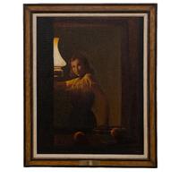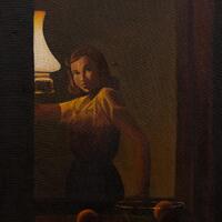 Joseph D. Atkinson, Jr., was an artist from Atlanta, GA. Solitude depicts a white woman posing in front of a mirror, illuminating her with a lamp. The woman stands slightly profiled while facing the viewer; her right hand is raised, and the left is in a fruit bowl.