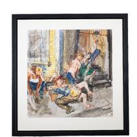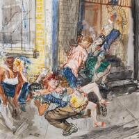 Calvin Burnett was a graphic artist, illustrator, painter, designer, and art teacher from Cambridge, MA. Horseplay is a watercolor depiction of an interracial group of young adults socializing. Two pairs are in a romantic embrace, one pair is dancing, and a trio shares a cigarette.