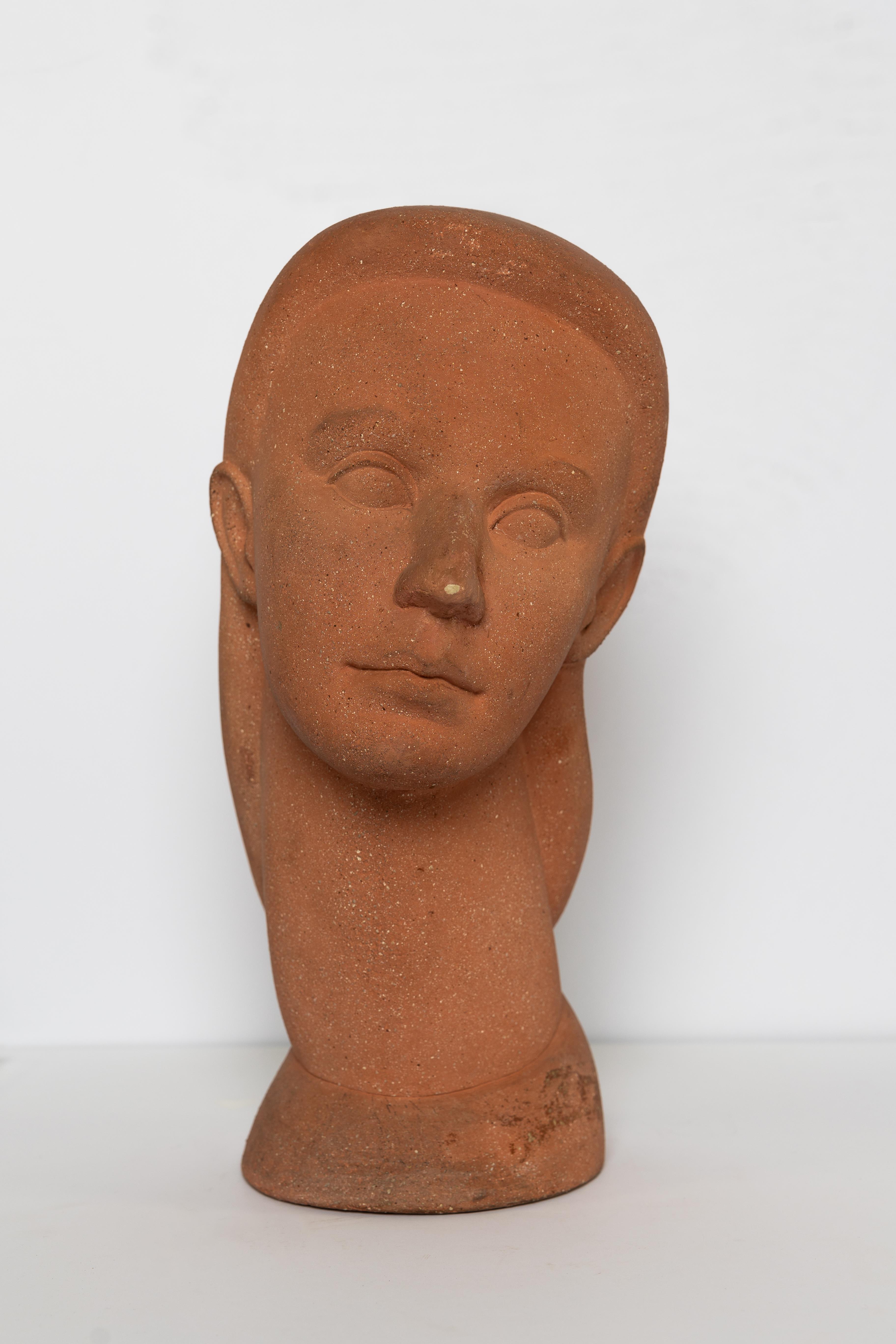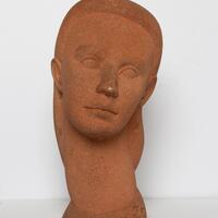 William Artis was a sculptor from Washington, DC. A Terra-Cotta Head is a bust of a woman with a solemn expression. The bust has a slight head tilt with an elongated neck.
