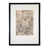 James H. Malone was a graphic artist, cartoonist, writer, and painter from Winterville, GA. My Classmate is a portrait drawing of a young Black boy in a school uniform. He sits in a chair with his hands on his lap, looking at the bottom left corner.