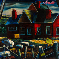 John Howard was an artist from Alcorn, MS. Arkansas Landscape shows a red house with a wooden gate, five posted signs, and six mailboxes in the foreground. The house is surrounded by dark green grass, leading to a mountaintop in the background. A sign pinned to a tree reads “For Sale” along with other titled signs throughout the landscape.