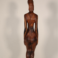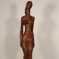 John W. Rhoden was a renowned sculptor from Birmingham, AL. Female Figure is a wooden sculpture of a nude woman. The woman's demeanor is peaceful, and she stands slack-armed with a relieved expression.