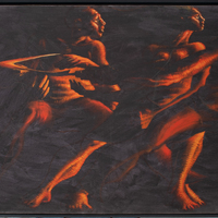 Oliver's painting shows a group of shirtless men looking towards an unseen figure or force. The painting makes heavy use of crosshatching and red and black hues. The composition bears significant resemblance to Oliver's mural Fire Fighters, which can be seen in the 1978 book, Black Art in Houston: The Texas Southern University Experience.