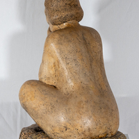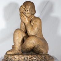 Hayward Oubre was a multimedia artist and educator from New Orleans, LA. In a Pensive Mood is a sculpture of a woman sitting in a worried position. Her hands cover her mouth and right eye as she sits with her left leg tucked under her right.