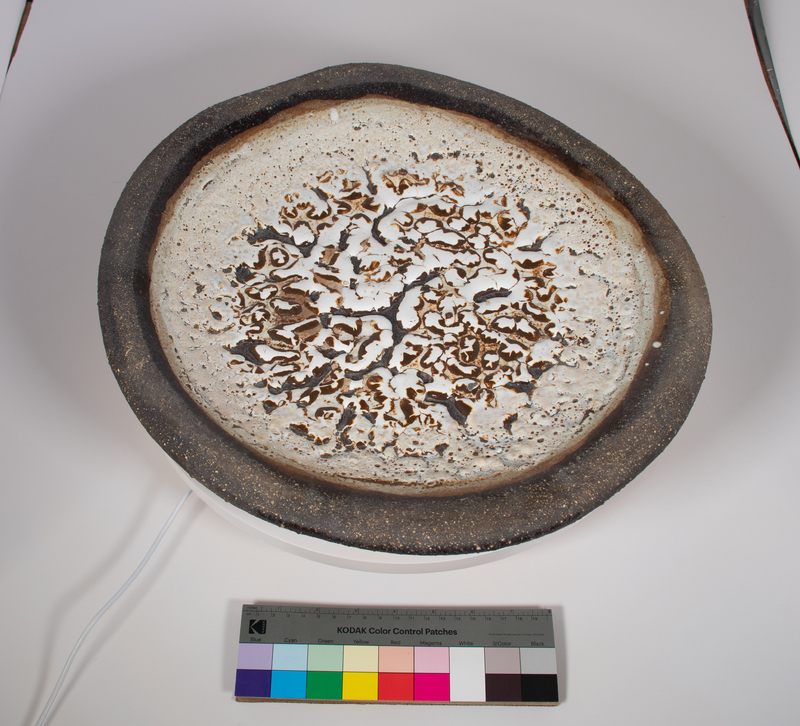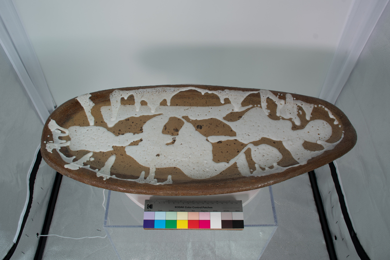 Simms’ large ceramic platter is made from clay with a splotchy white glaze on the top. Carroll Harris Simms worked alongside Dr. John T. Biggers to establish the Texas Southern University Art Department. Simms taught sculpture, ceramics, and jewelry-making classes.