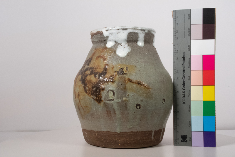 Simms’ ceramic vessel is round and stout, with ridges and a node at the top, and has a maroon and gray glaze. Carroll Harris Simms worked alongside Dr. John T. Biggers to establish the Texas Southern University Art Department. Simms taught sculpture, ceramics, and jewelry-making classes.