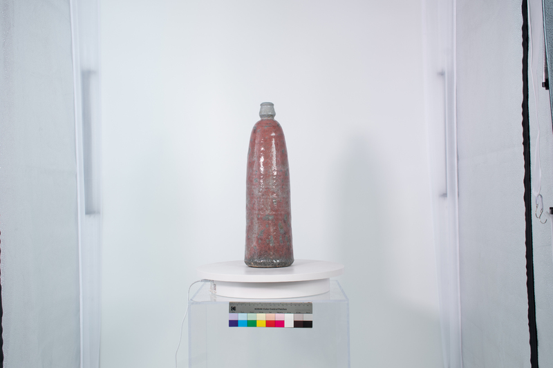 Simms’ ceramic vessel is hollow, with an opening at the top, and has a red and gray glaze. Carroll Harris Simms worked alongside Dr. John T. Biggers to establish the Texas Southern University Art Department. Simms taught sculpture, ceramics, and jewelry-making classes.