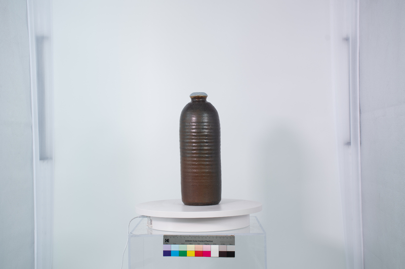 Simms’ ceramic vessel is hollow, with an opening at the top, and has ridges and a dark maroon glaze. Carroll Harris Simms worked alongside Dr. John T. Biggers to establish the Texas Southern University Art Department. Simms taught sculpture, ceramics, and jewelry-making classes.
