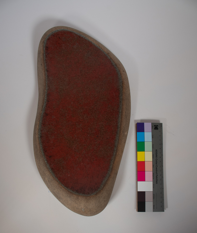 This large, oblong ceramic plate created by Carroll Harris Simms has a red glaze. This piece is among those that Professor Simms chose to feature in the 1976 book he co-authored with Dr. Biggers and John Edward Weems, Black Art in Houston: The Texas Southern Experience.