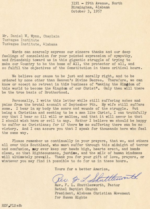A letter from Rev. Fred L. Shuttlesworth to Chaplain Gary for prayers and well wishes after he and his wife from receiving physical injuries from participating in civil rights movement.