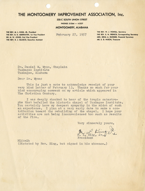 A letter from Dr. Martin Luther King Jr. to Chaplain Wynn thanking him for his support of his article in the Christian Newspaper article in The Christian Century and offering condolences for what happened to burning of the original Chapel Building.