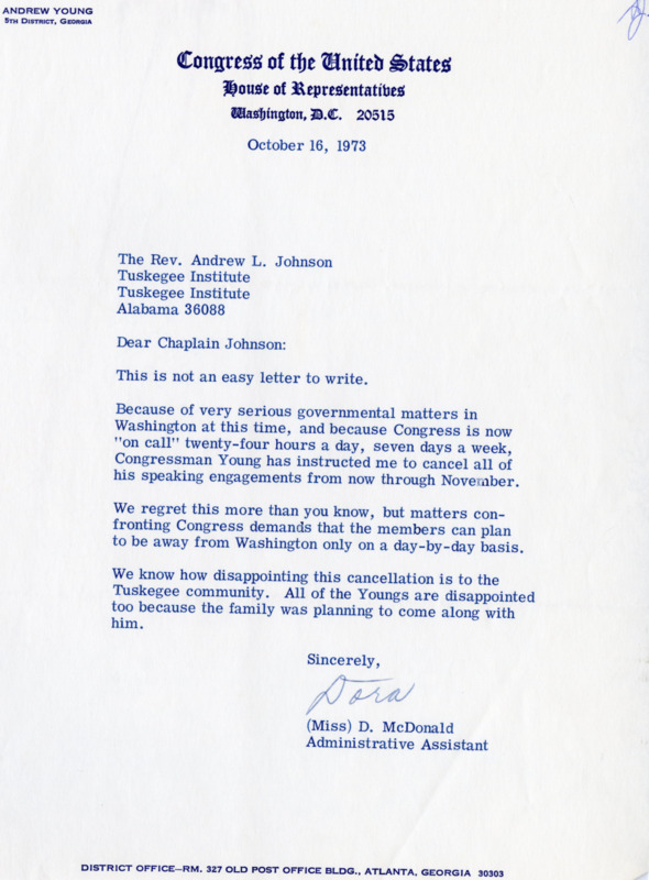 A letter from Miss Dora McDonald to Chaplain Johnson expressing regret that Congressman Young and his family will not be able to come to Tuskegee due to serious government matters.