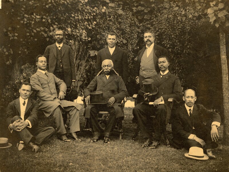 Booker T. Washington welcomed the Liberian Commission to the United States in 1909. This photograph shows the Commissioners seated from left to right: Charles B. Dunbar, G. H. Gibson, a former president of the Republic of Liberia, J. J. Dossen, a former Vice President of the Republic.