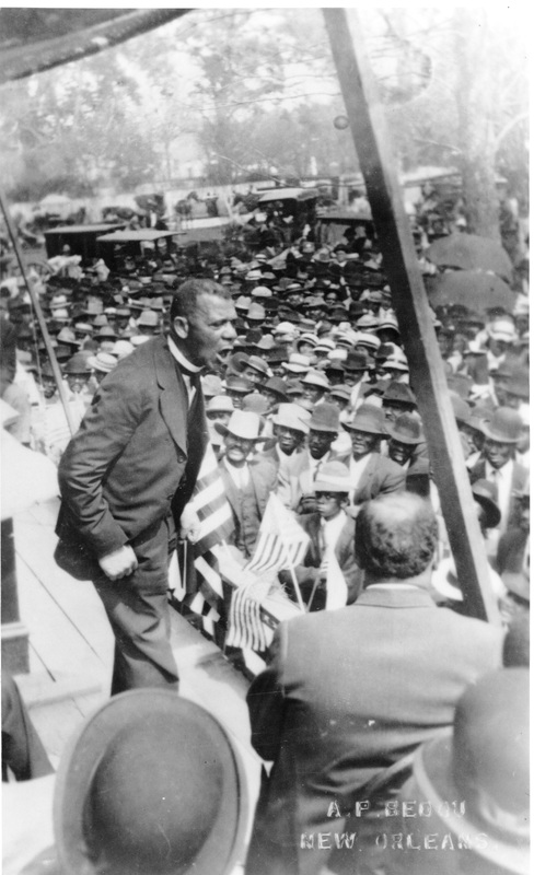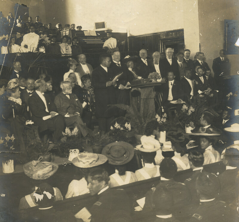 Black and white image of Booker T. Washington giving a speech in the old chapel building. Some notable figures are Andrew Carnegie and William H. Taft.
