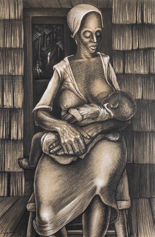 John T. Biggers was an educator, painter, and muralist from Gastonia, NC. Young Mother depicts a woman breastfeeding her baby. The seated woman is wearing a nightgown and kerchief while caring for the baby. The baby wears a onesie as he feeds from his mother. Various people are outside the windows of the wooden homes.