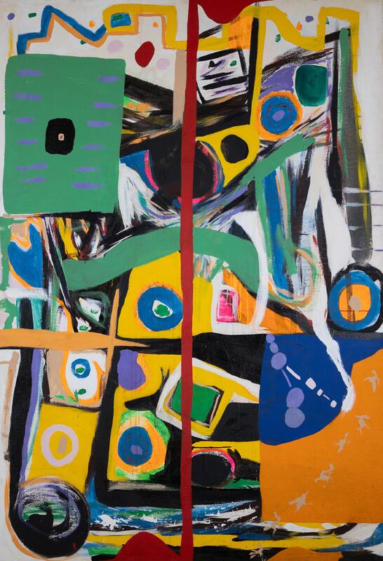 Skunder Boghossian was an artist from Addis Ababa, Ethiopia. Untitled depicts a spiritual scene of four masquerade figures hanging from a central pole. The four masquerades each wear different masks and wear beads, shells, and bands of color patterns.