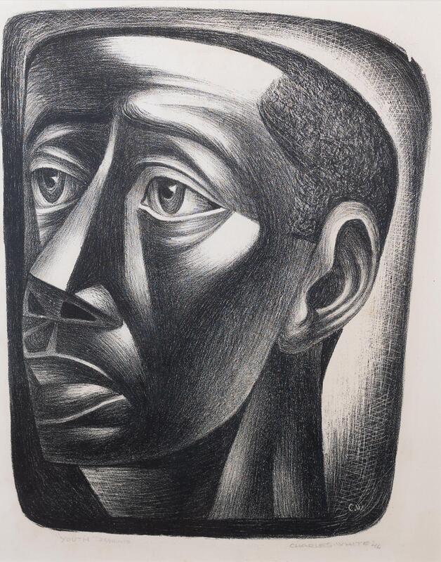 Born in Chicago, Charles White was a painter, printmaker, muralist, and educator known for his stylistic approach to Black subjects. Youth is a lithograph portrait of a young man looking into a far-off distance. Cross-hatching contrasts shadow and light across the young man’s face.