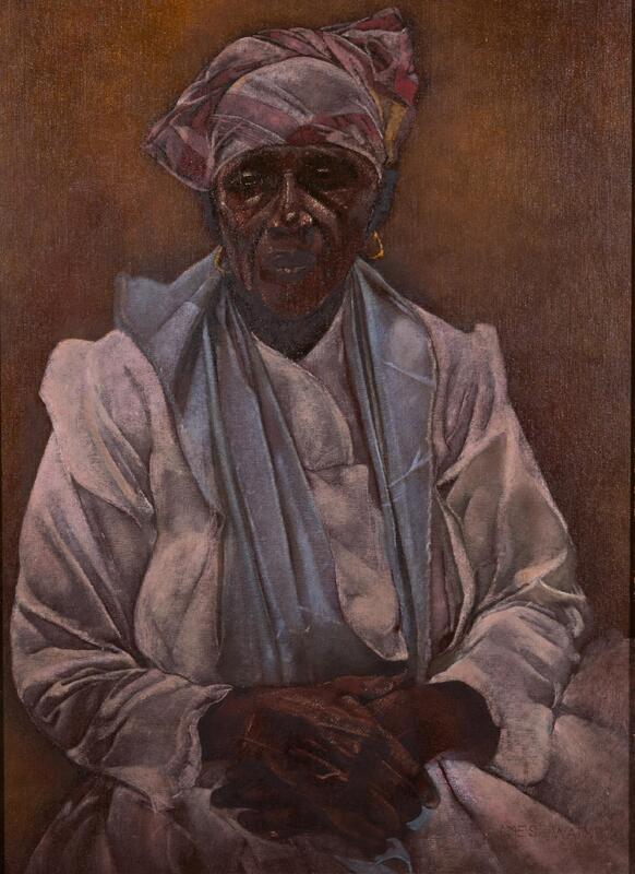 James Watkins was an artist from Akron, OH. Widow Woman is a portrait of an elderly Black woman wearing a long white dress, a light blue shawl, a pink headwrap, and small golden earrings. She looks straight ahead in solitude, her hands folded over one another.