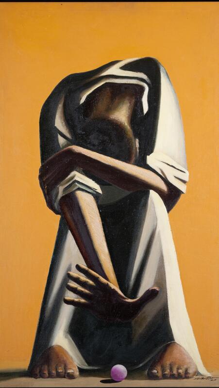 Benjamin Britt was a figurative, surrealist, abstract painter and art teacher from Winfall, NC. Yield Not depicts the debilitating nature of mental health issues and their impact on human perception and potential. The subject is cowering with his head in his lap as he reaches toward a small pink ball that he perceives as out of his reach.