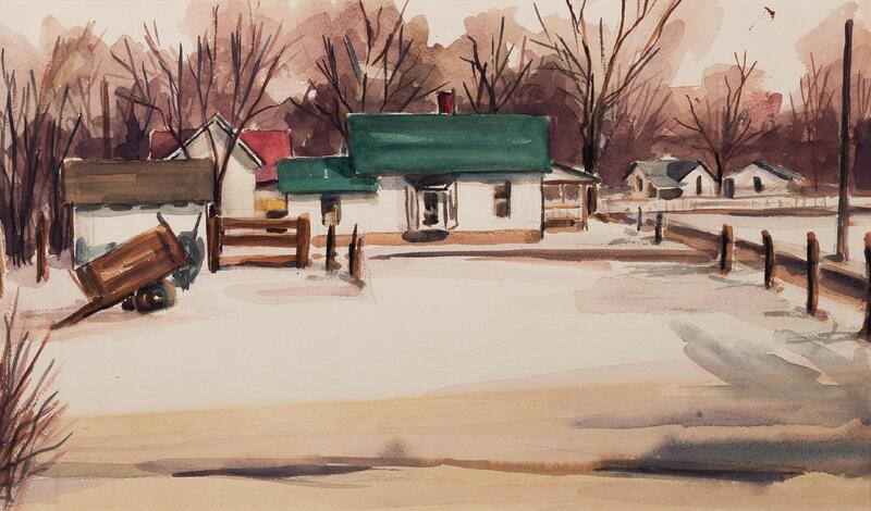 Julia Ann Fields was an artist from Lawrence, KS. Winter Feeling illustrates a residential area after a snowfall. The painting depicts a green-roofed house with a shed and wheelbarrow. In the background are three other homes in various colors and barren trees.