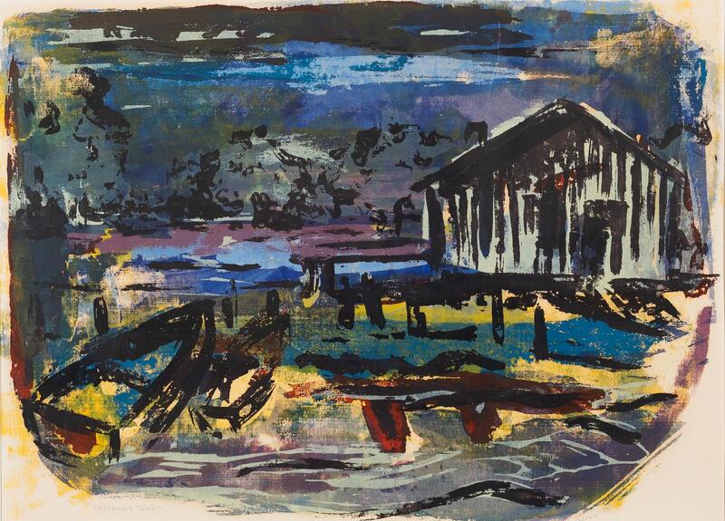 Samella Sanders Lewis was a printmaker, painter, sculptor, and art historian from New Orleans, LA. Trapper's Rest depicts a fishing pier at night. Two boats, fishing equipment, and a pier lodge, which fishermen often use for rest and storage, are positioned alongside the pier.