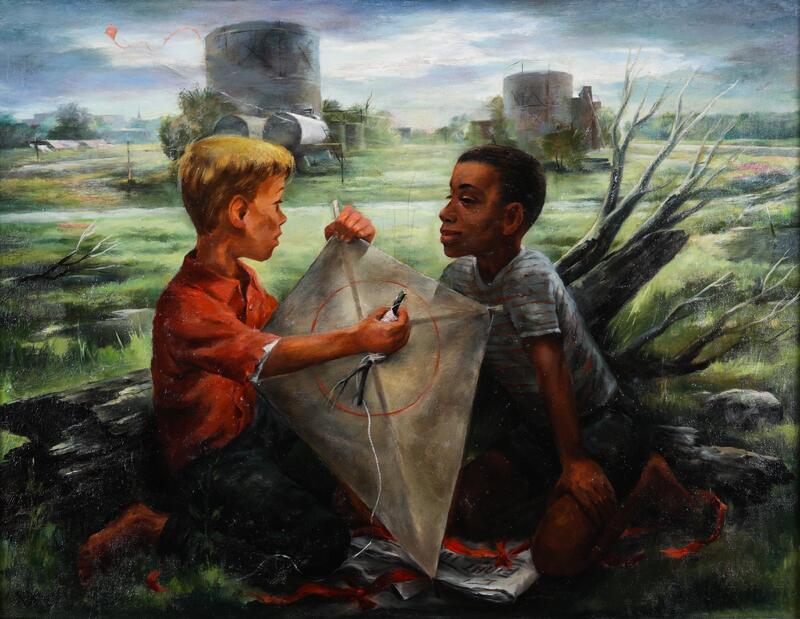 Cecil D Nelson Jr. was a 20th-century painter born in Champaign, IL. The Kitemakers shows two children sitting in a field before a log. A white boy on the left wearing a red shirt holds the kite while looking at a young Black boy on the right wearing a blue shirt. An orange kite flies in the background near two gas tanks and a grain bin.