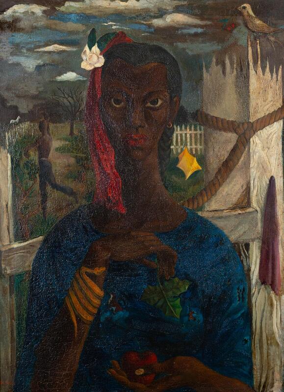 Frederick D. Jones, Jr. was a mid-twentieth-century artist from South Carolina. The Daughter of Eve depicts a woman wearing a ripped blue top, red lipstick, a snake bracelet, a red scarf, and a white magnolia in her hair. She holds a red apple and a green leaf and stares toward the viewer. Behind her is a white horse, a yellow tent, and a man dancing.
