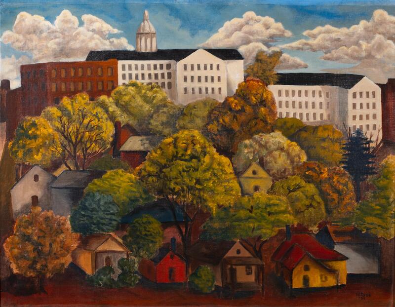 William E. Rice was an artist from Tallahassee, FL. The Capitol is a perspective painting of a residential area beside a Capitol building. In the foreground are several houses with multi-colored trees between them; in the background are larger buildings, including the Capitol, under a cloudy blue sky.