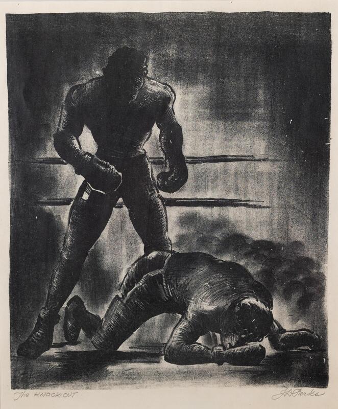 James Dallas Parks, born in St. Louis, Missouri, was a painter, sculptor, printmaker, and art historian. The Knockout depicts the iconic photograph of the Muhammed Ali versus Sonny Liston boxing match. Ali stands in a victor’s stance above Liston as he struggles to rise.