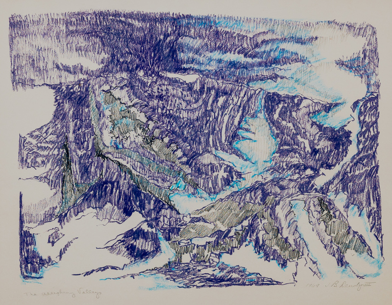 J. Brooks Dendy III was a painter, graphic artist, and educator from Pittsburgh, PA. The Allegheny Valleys depicts an aerial view of a mountain range, valley, and river in Western Pennsylvania.