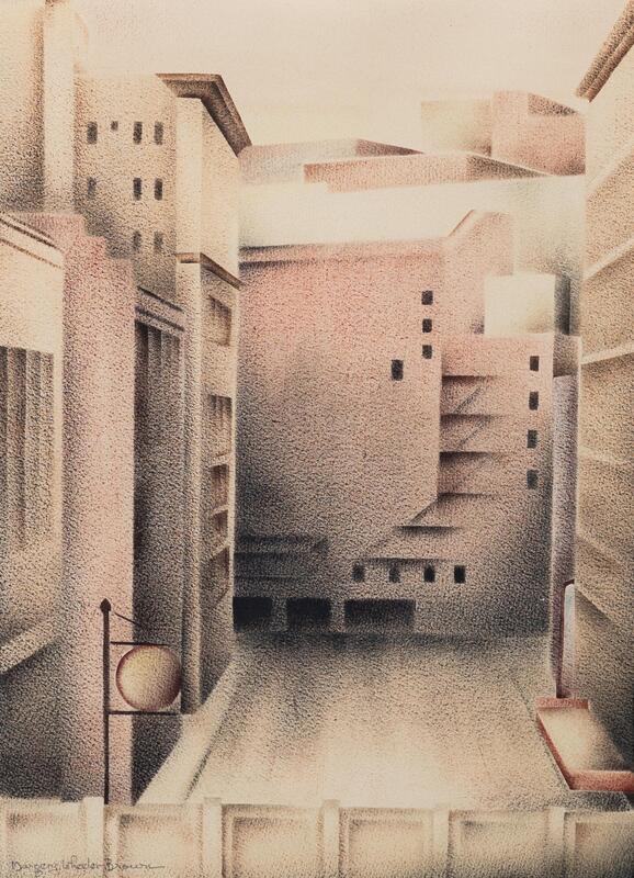Marjorie W. Brown, born in North Carolina, was an artist who studied art at Spelman College. The City Is A Pattern is a watercolor artwork that shows the linear perspective of a city. Brown uses repeating lines and geometric shapes for buildings, windows, signs, and sidewalks to show a consistent landscape pattern.